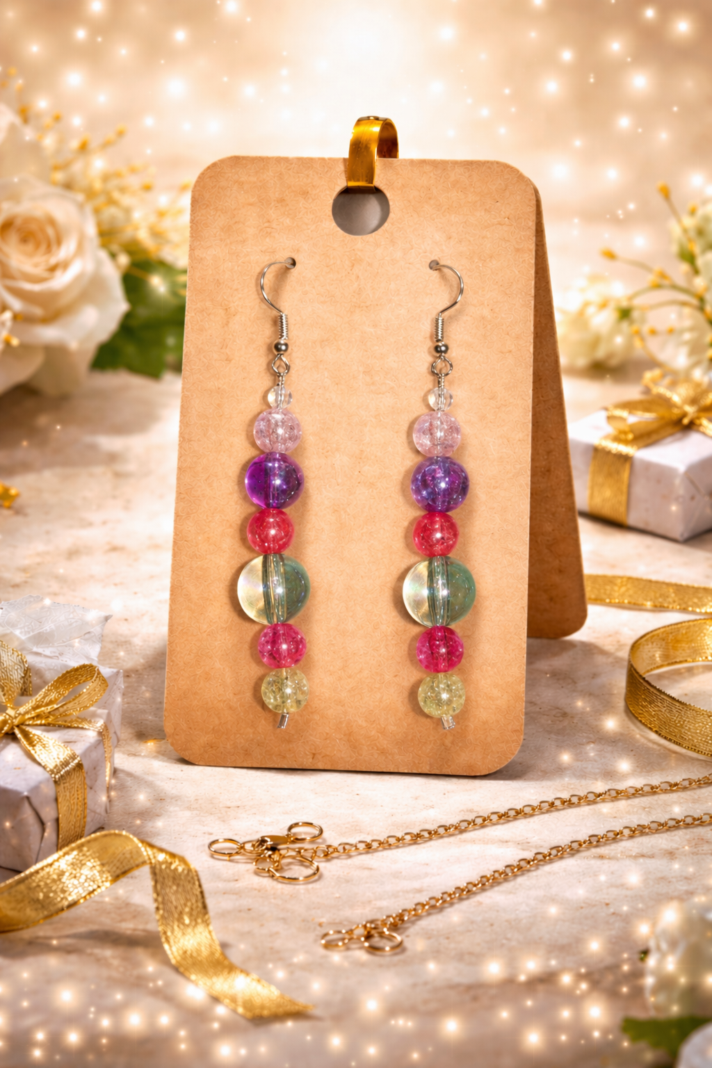 These drop earrings showcase a playful pop of color with bright purple, pink, and blue beading, and a dash of pale yellow to round them out. They pair nicely with any wardrobe choice and give you a bright burst of color to brighten any day.
