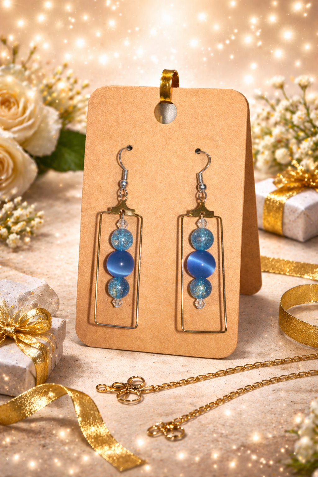Modern geometric dangle earrings featuring layered blue beads framed in a sleek rectangular design. The mix of deep and shimmering tones adds depth and subtle sparkle, making them perfect for both everyday wear and dressier occasions. Lightweight and effortlessly stylish, they bring a cool, polished finish to any look.