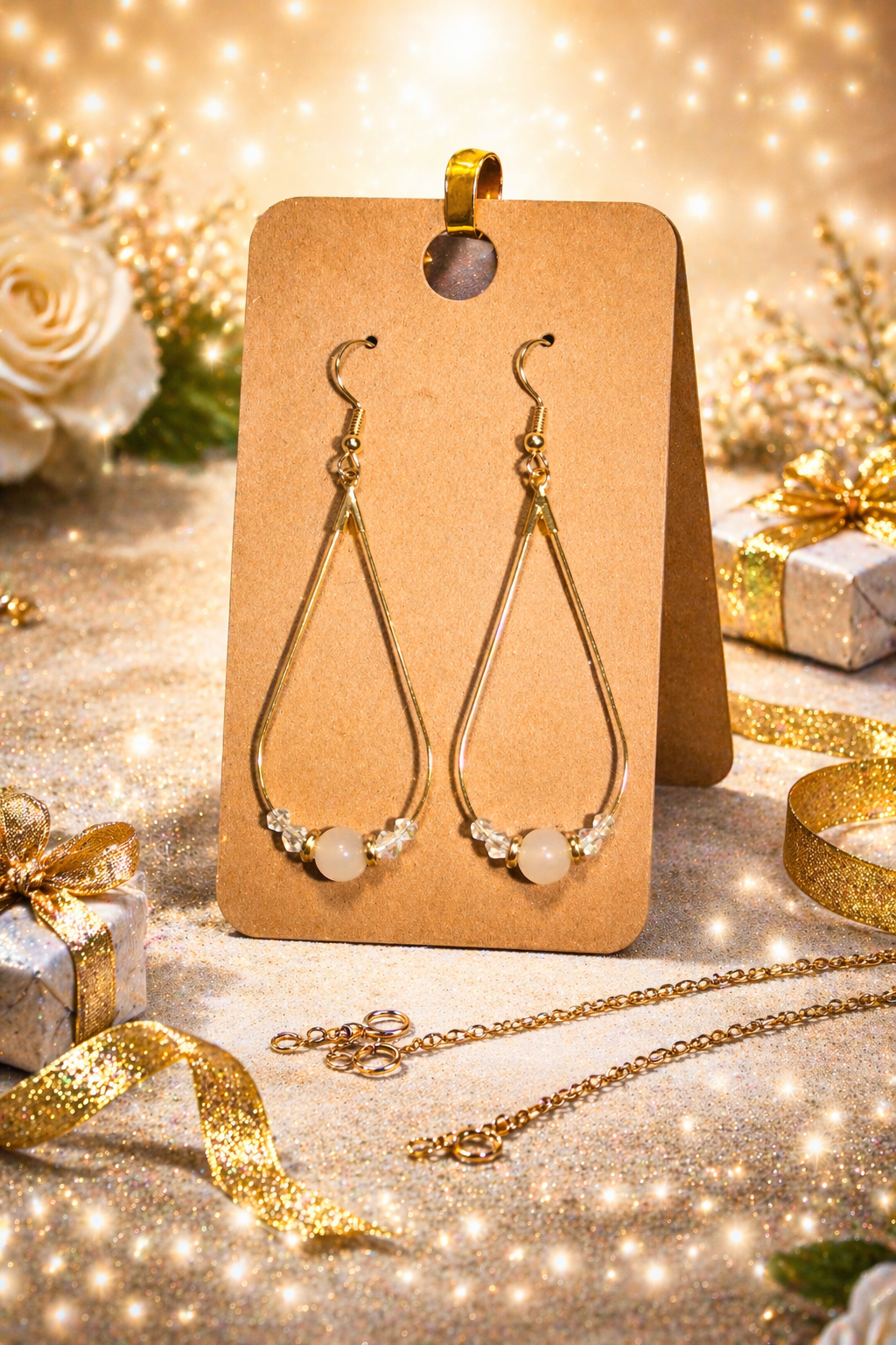 These teardrop dangle earrings provide soft and subtle crystal accents framing a pale yellow centerpiece bead that catches the gold and crystal and mirrors it back at the admirer. They are elegantly subtle, adding a simple yet stylish touch to your work or play attire.